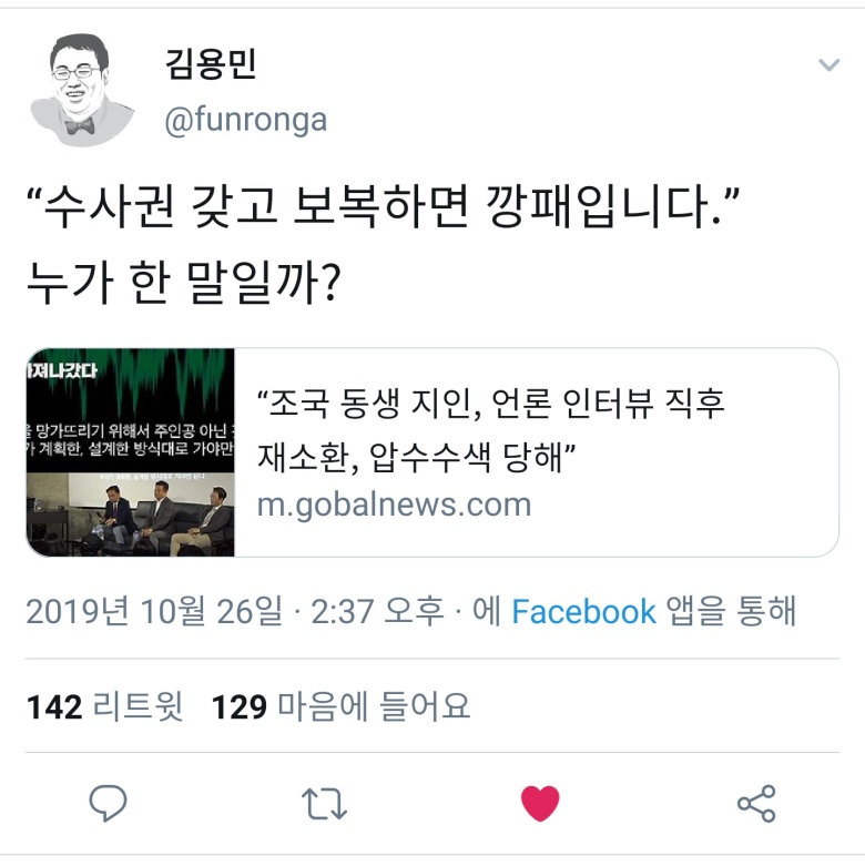 | 조국 5촌조카 반발, 정경심에 "자신들은 죄 없다는 거냐""남의 죄 덮어썼다는 얘기에 너무 화가 났다" (0) | 2019.10.25 |