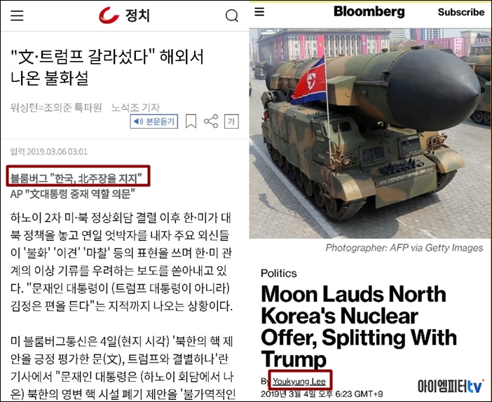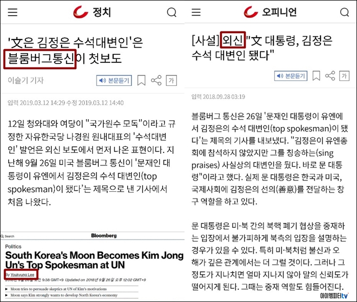 - '문재인은 김정은 대변인'라는 기사로 수많은 국내 언론에 인용당함